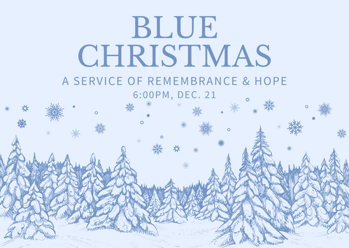 Join us for our Blue Christmas service on Sunday, December 21, at 6:00pm for a time dedicated to the difficult emotions of the holidays. This service invites you to bring the grief, love, and difficult emotions you have in the midst of a season known for joy and light.